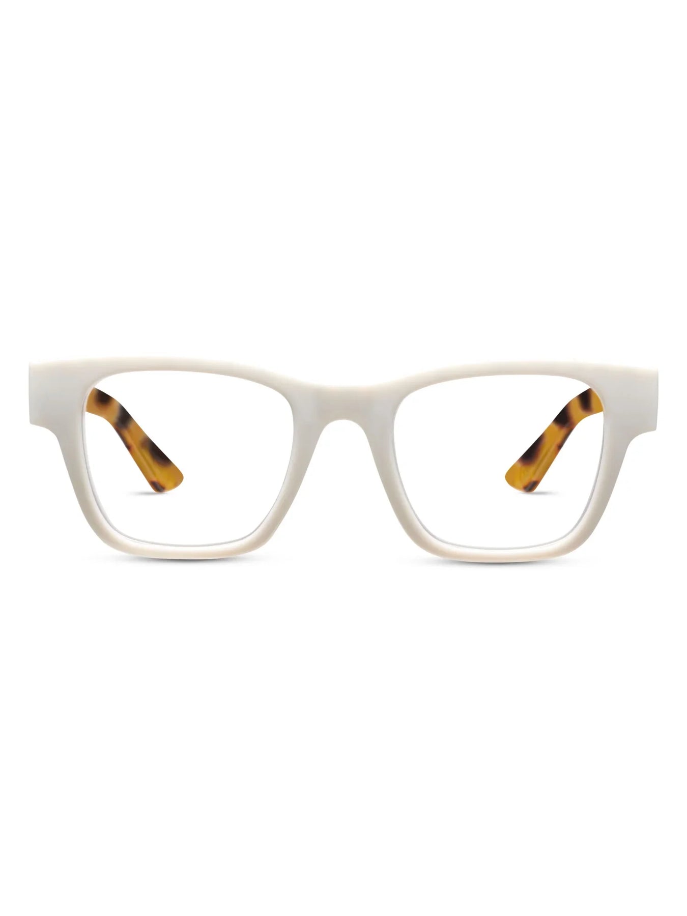 White eyeglasses with tortoiseshell accents on a white background, front.