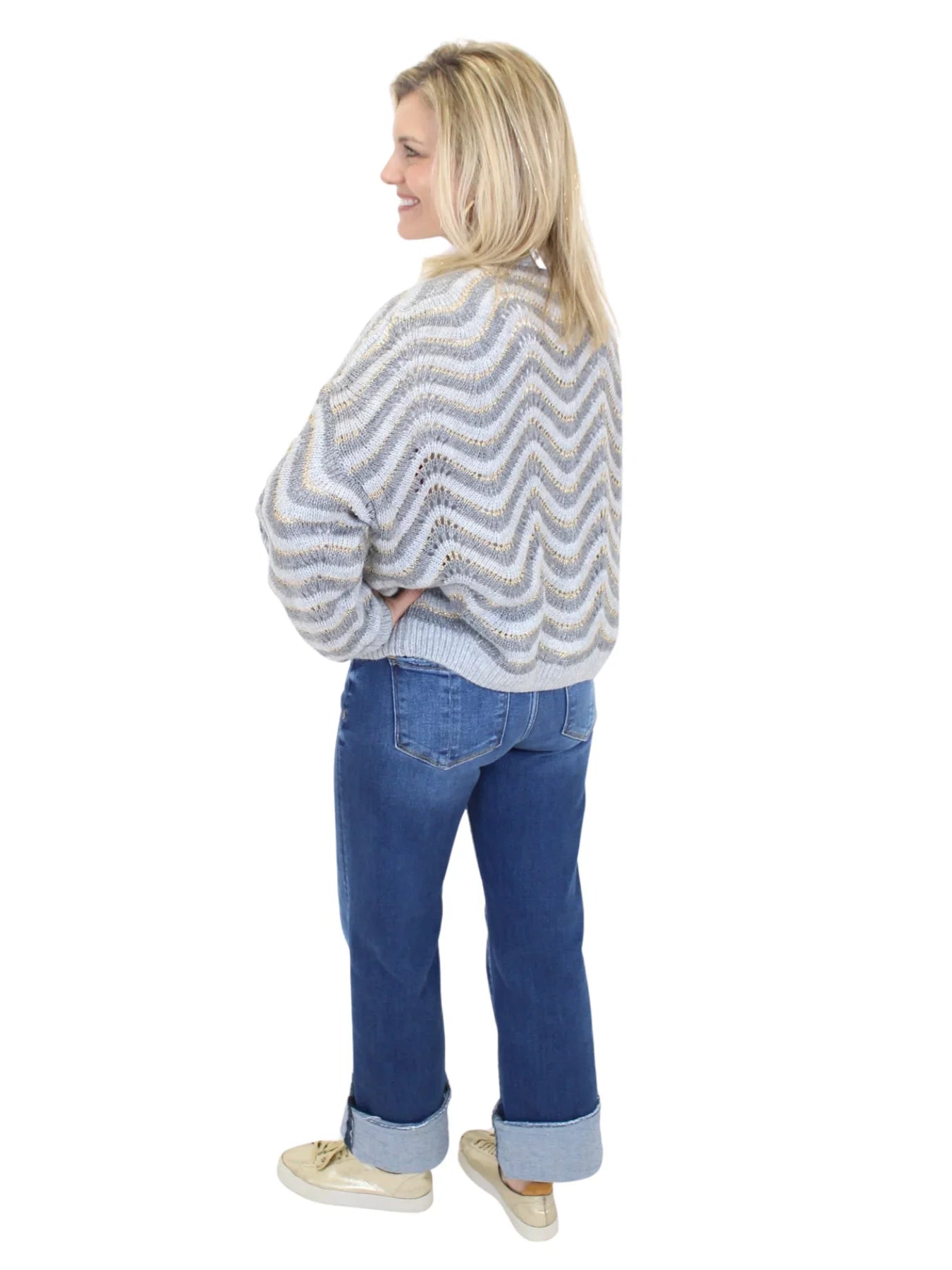 The Grey Wavy Striped Oversized Sweater features a cozy fabric with a subtle shimmer from its grey and metallic gold wavy stripe pattern. Its oversized drop shoulder fit ensures comfort and a relaxed silhouette, while ribbed cuffs and hem provide gentle structure. This versatile sweater effortlessly blends warmth and style for any occasion.
