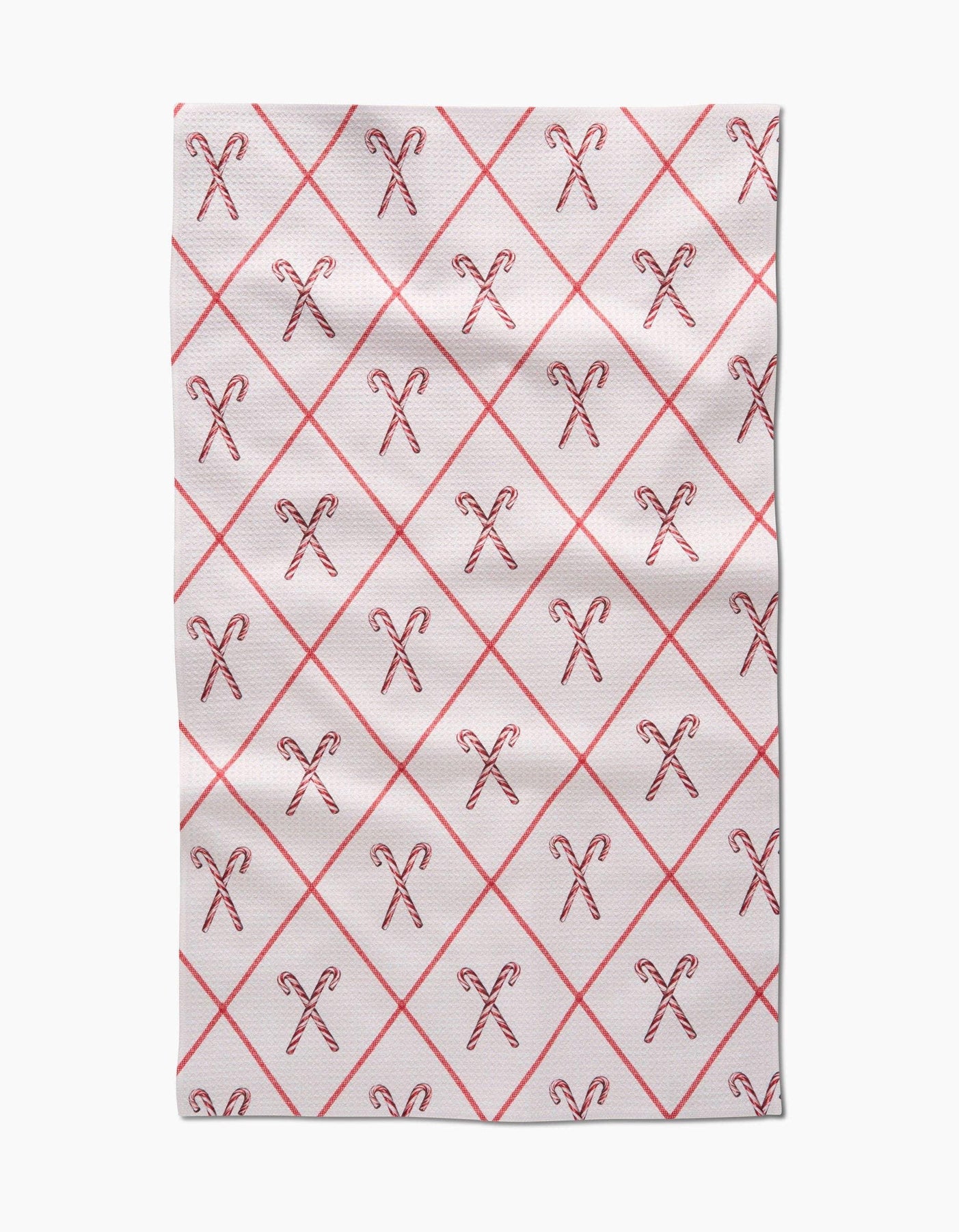 This kitchen tea towel features a festive candy cane print with a diamond stripe pattern. Function meets festive in this holiday inspired tea towel!