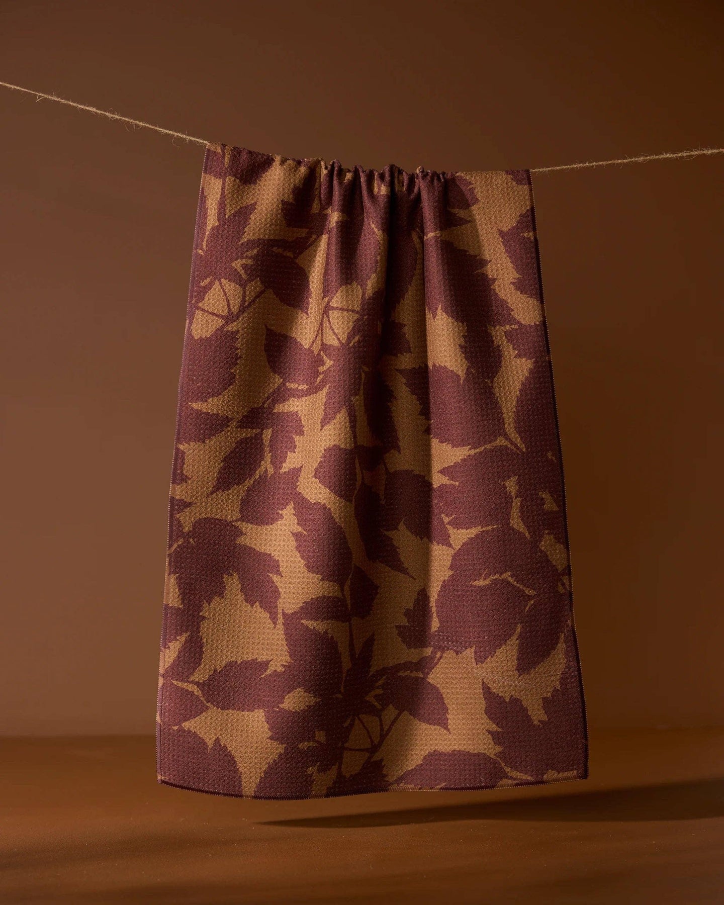 A kitchen tea towel with a leaf print in rich brown tones. Perfect for welcoming the Fall season.