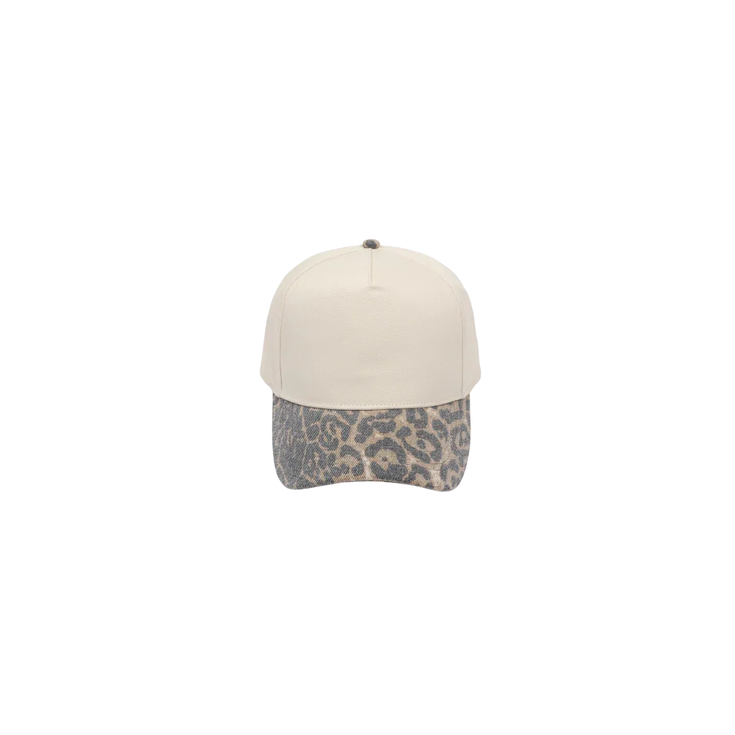 Turn heads with this chic two-tone baseball cap, featuring a sleek cream crown paired with a bold leopard print brim. The perfect mix of classic and trendy, this one-size-fits-most design delivers all-day comfort and standout style. Wear it solo for a fashion-forward edge or customize it with our patches to make it uniquely yours.