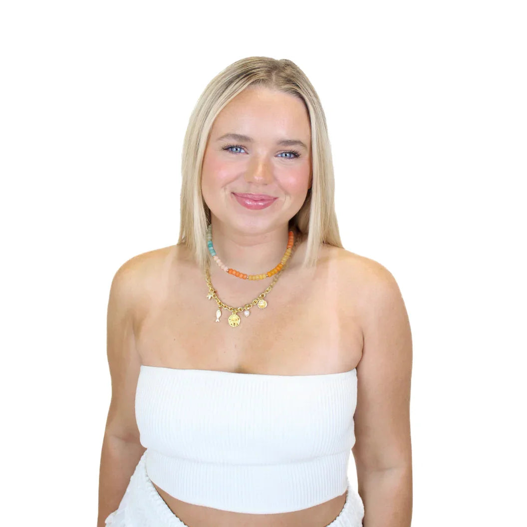 Enhance your style with the Tropical Tide Beaded Necklace, perfect for adding a vibrant, island-inspired touch. This dainty necklace features delicate cool-touch beads in refreshing tropical hues, elegantly accented with gold accents, offering a unique and exotic feel.
