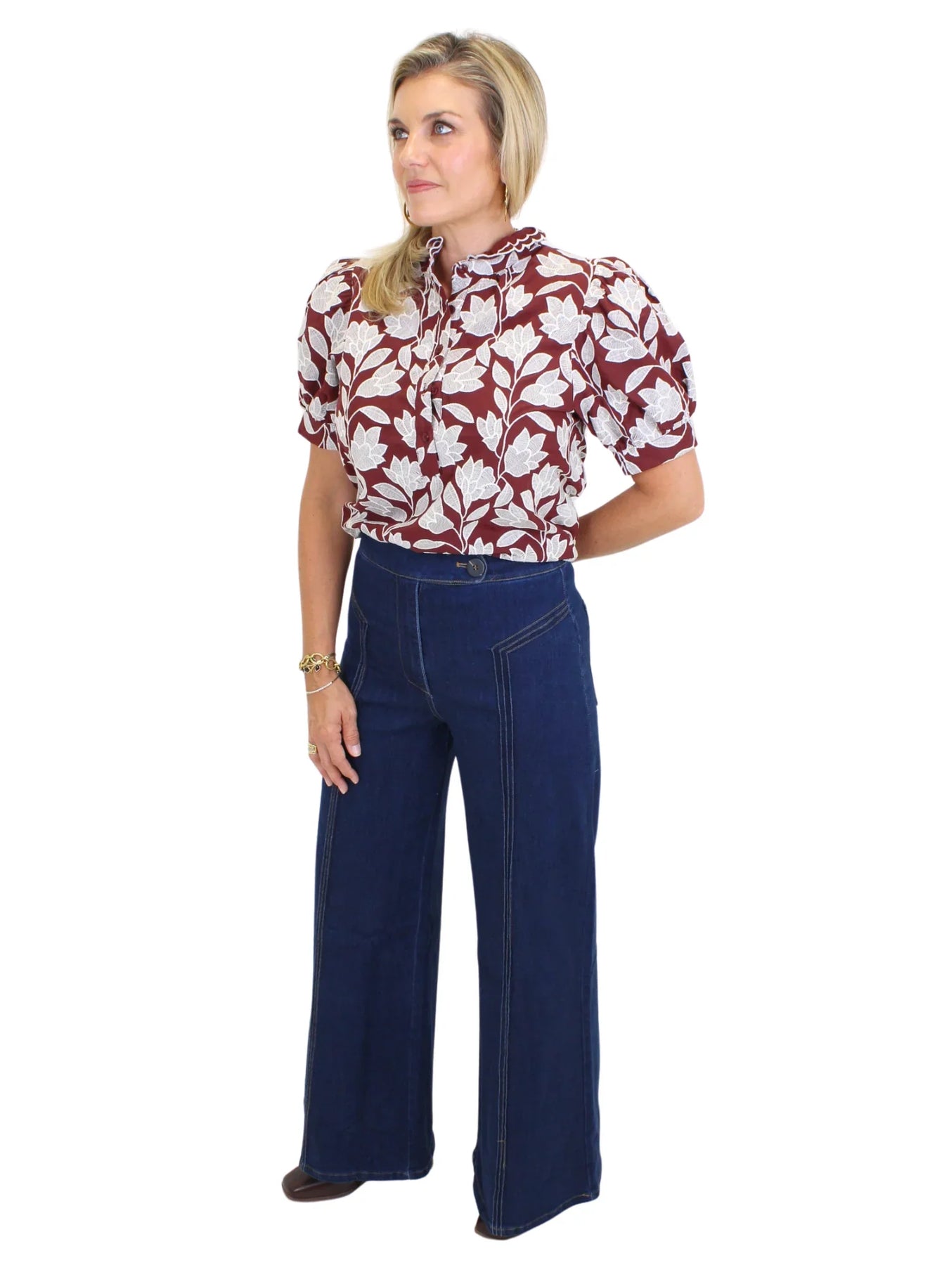 These dark wash wide leg jeans blend vintage style with modern tailoring. Featuring a button closure and a distinctive front seam design, they provide a flattering silhouette and a classic retro vibe. The wide leg cut offers a relaxed and comfortable feel, making them a versatile and stylish addition to any wardrobe.