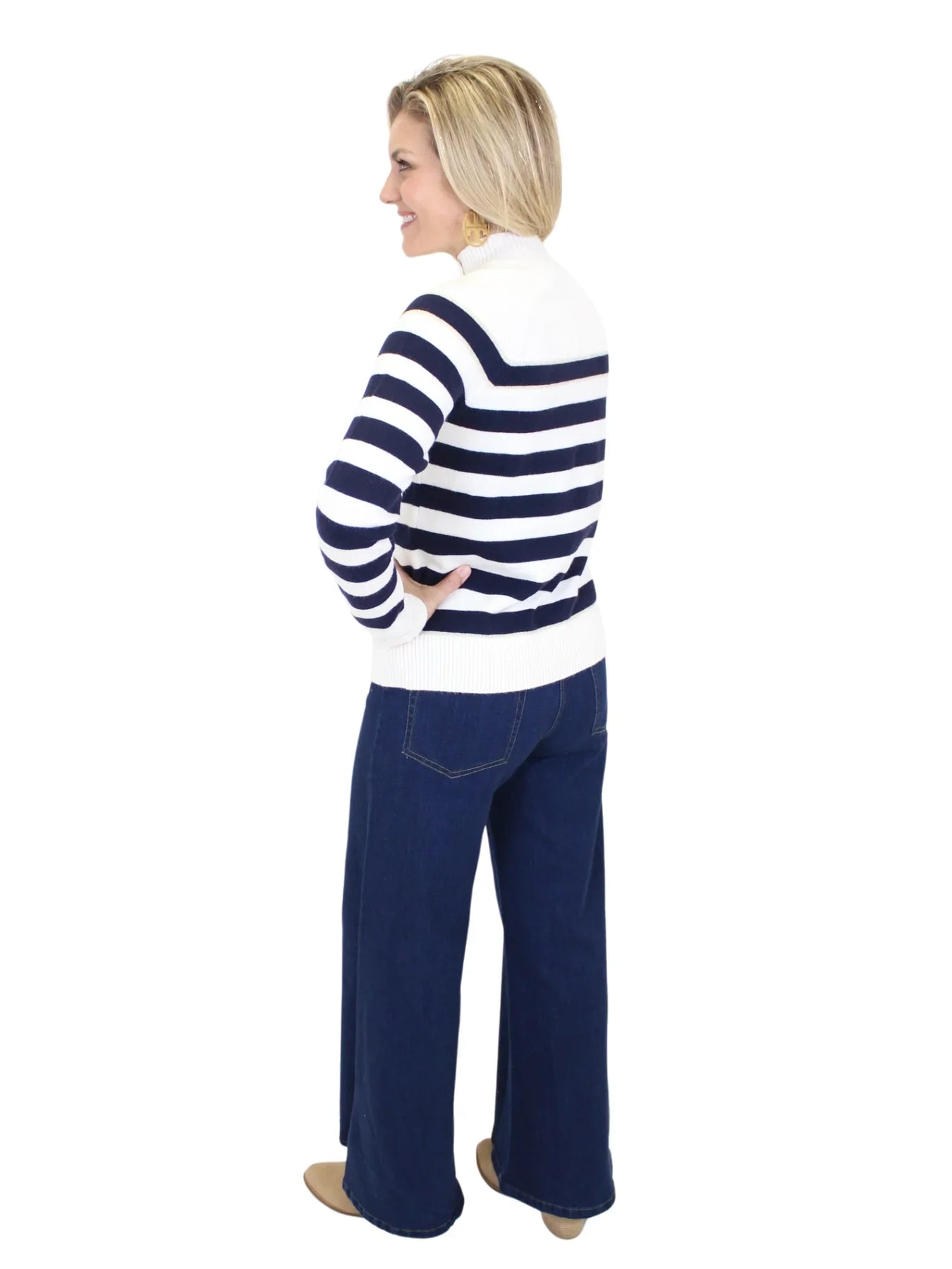 Elevate your wardrobe with this Classy Mock Neck Striped Sweater, featuring a refined off-white and navy palette. The gold buttons on the left shoulder add a sophisticated touch, while subtle shimmer stripes enhance its elegant design. Crafted from soft, lightweight fabric, this sweater offers both comfort and style, making it an ideal choice for polished, everyday wear.