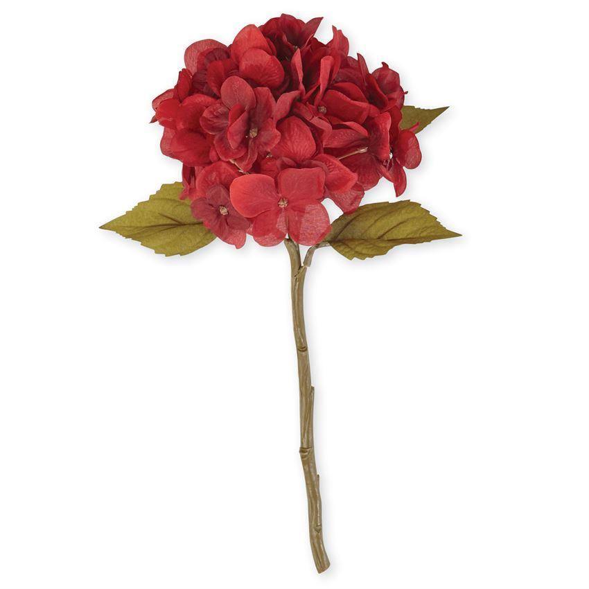 Red silk hydrangea blossoms rest on adjustable faux stem.