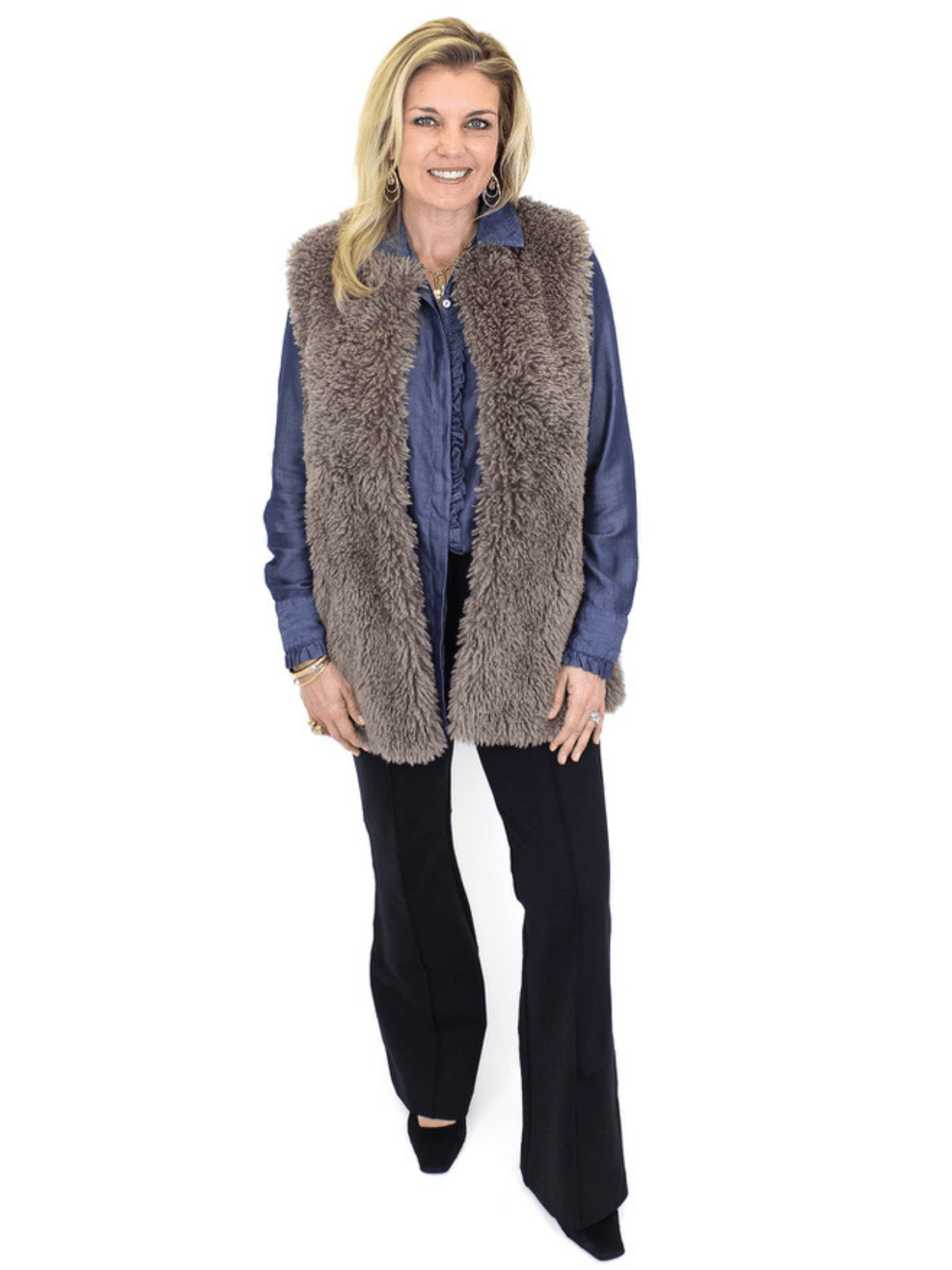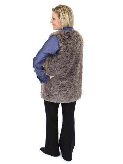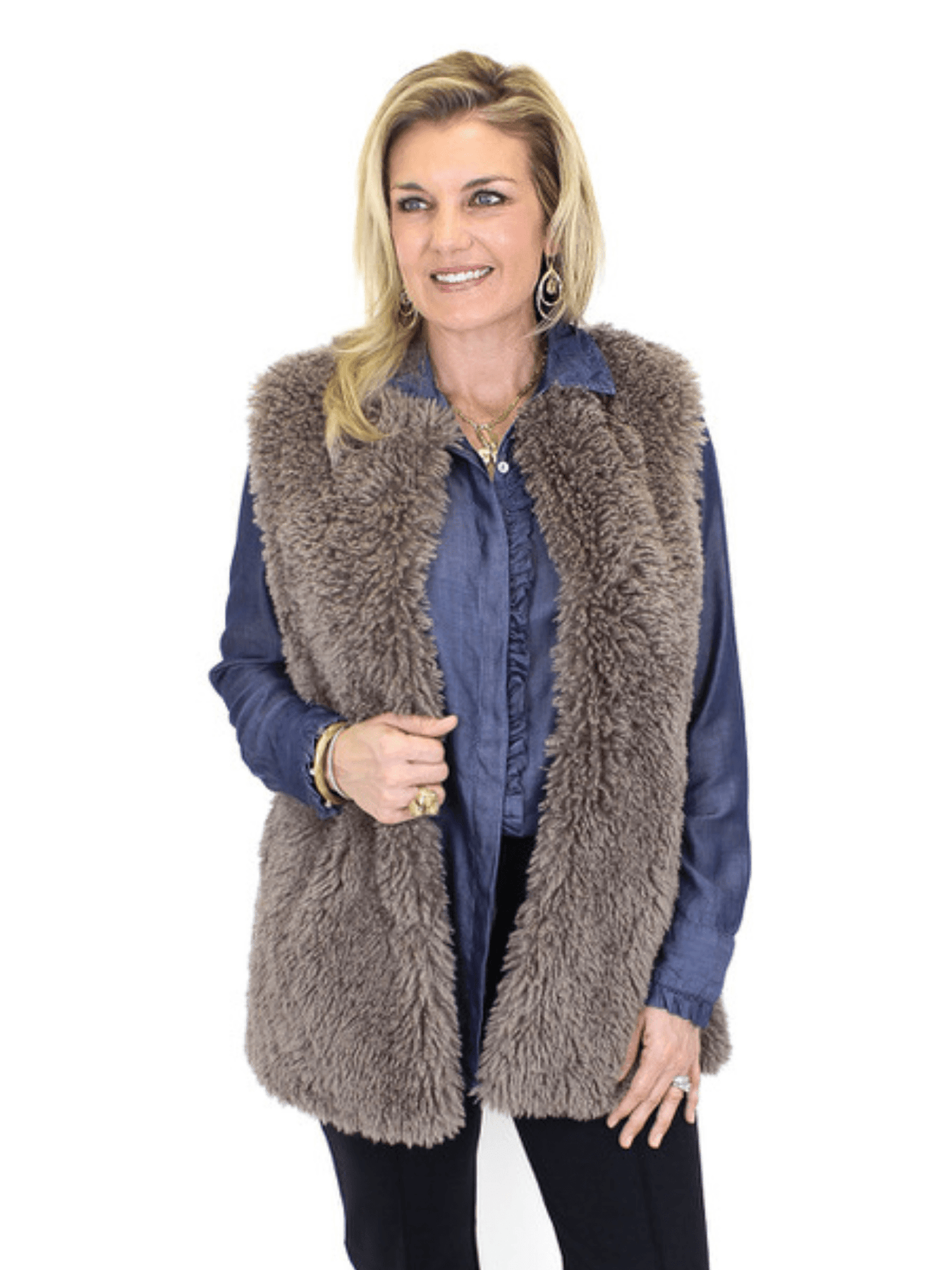 Add a luxurious touch to your wardrobe with the Charlie B Long Faux Fur Vest in Taupe. Made with a soft faux fur material, this vest provides ultimate warmth and comfort. Featuring an open front with a hook closure and side pockets, it's perfect for layering over tops and dresses. Elevate any outfit with this stylish and versatile piece!
