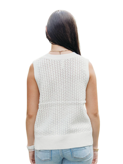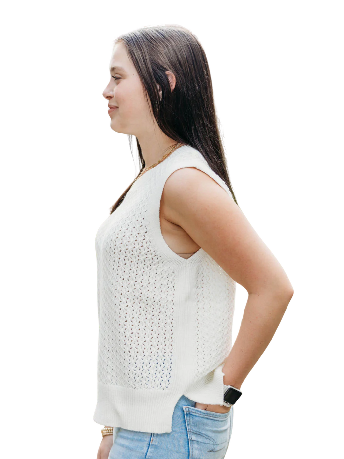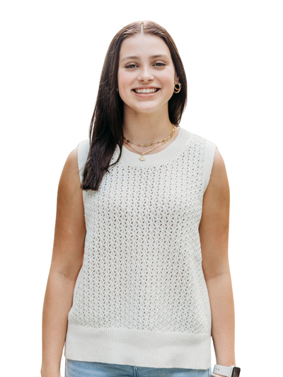 Introducing our Crochet Tank Top in Ivory - the perfect addition to your spring and summer wardrobe. With its lightweight and breathable open crochet design, this top is both feminine and chic. The ribbed details on the neck, arm openings, and hem add a touch of elegance while the split hem adds versatility. Pair it with your favorite jeans or shorts for a relaxed yet classy look or dress it up with trousers or a skirt! Expertly crafted for comfort and style, this tank will be your go-to!