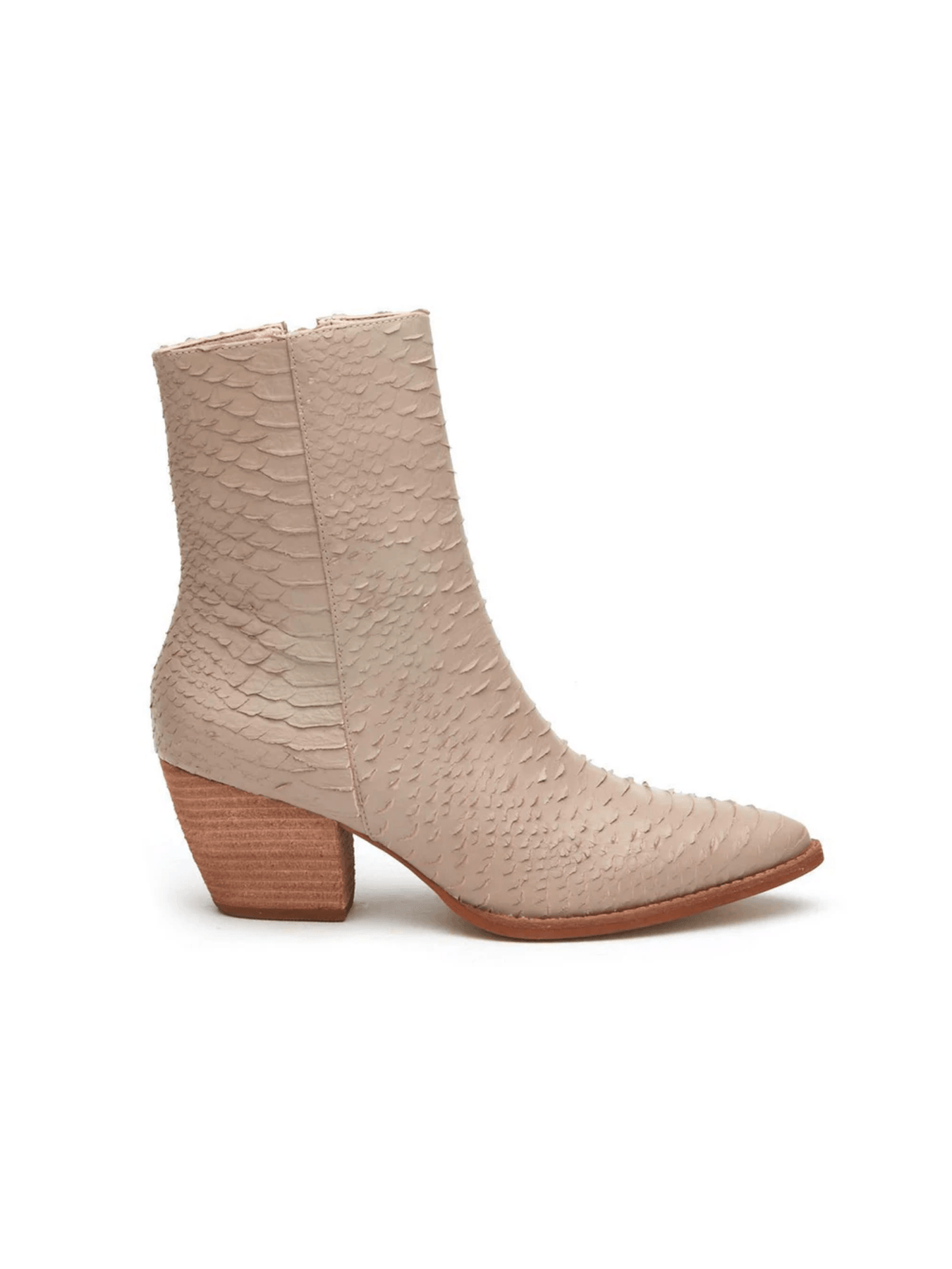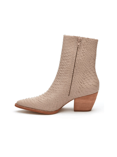 A legacy style, western-inspired modern ankle boot with a pointed toe. In a stunning ivory snakeskin.