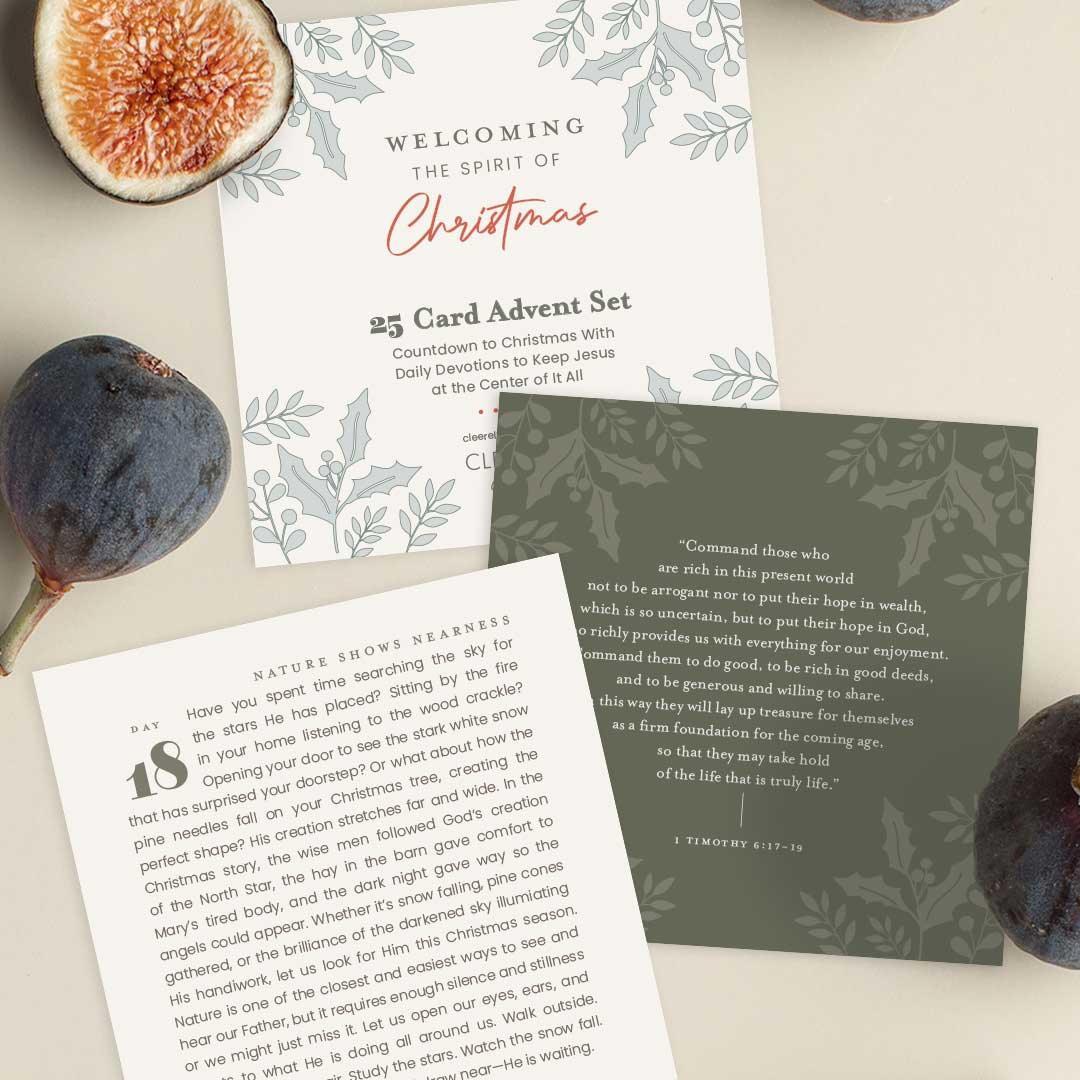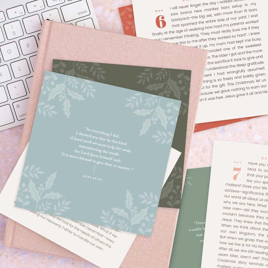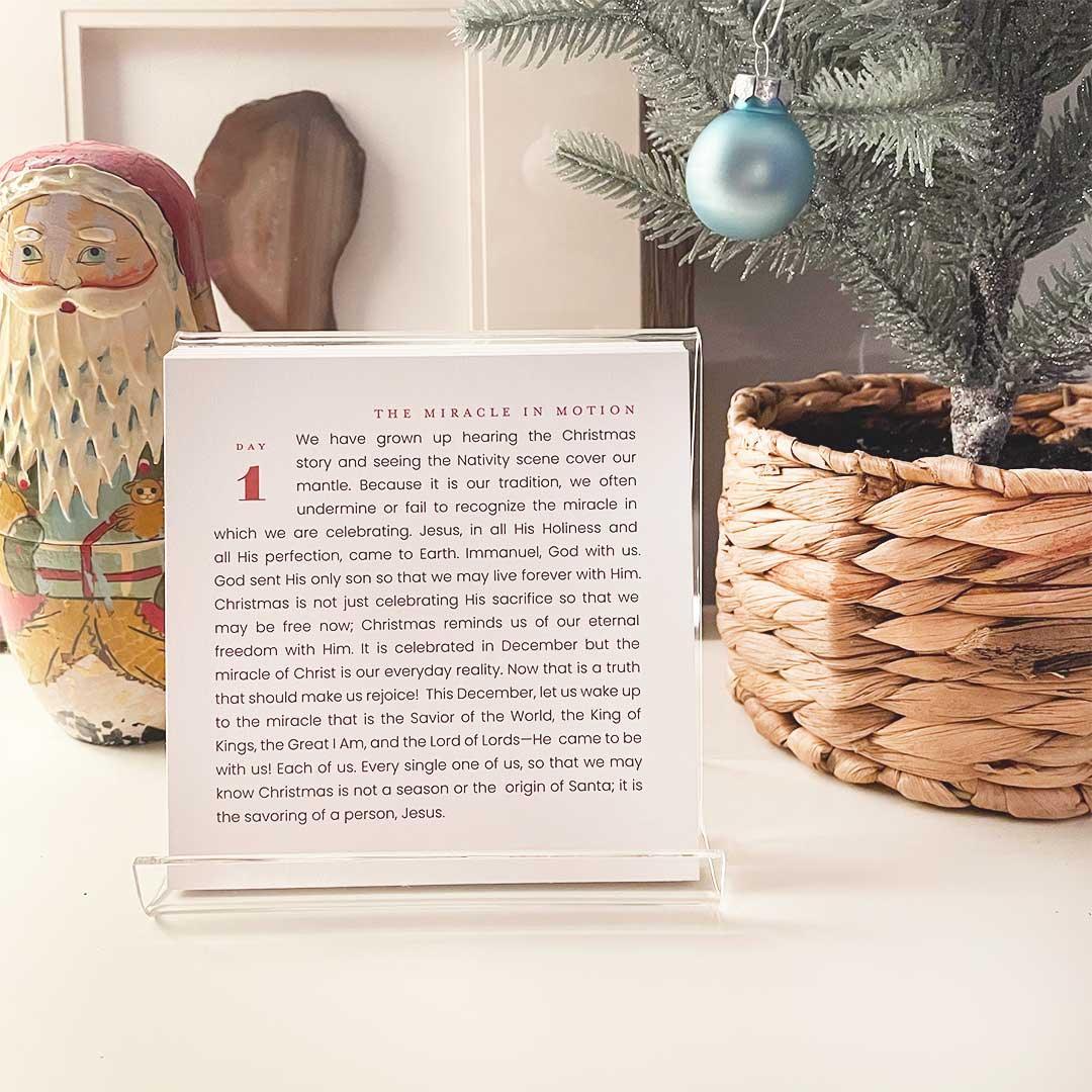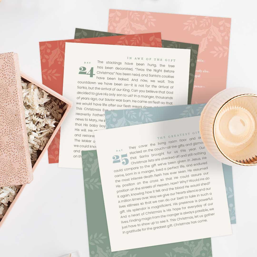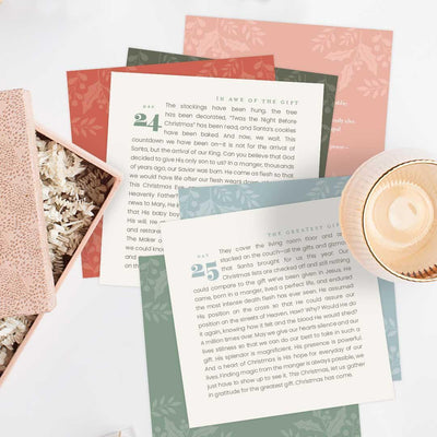 Christmas time is so wonderful! Magical. Exciting! But sometimes we let the hustle and bustle of the obligations, full schedules, and to-do's consume us and we miss the greatest gift and point of it all—being with Jesus. This set includes a devotion for every day—from the first of December all the way 'til Christmas Day, helping prepare our hearts to cultivate the spirit of Christmas in our everyday lives. My hope is that as you dive into the different perspectives and details mentioned in this set, that it would help you see Christmas in an even more magical way.